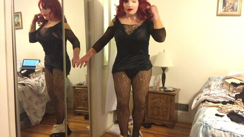 Deanna CD doll strips down to her black bodystocking, showing off all her curves, enjoying how she looks in the mirror and fucking herself with her big dildo.